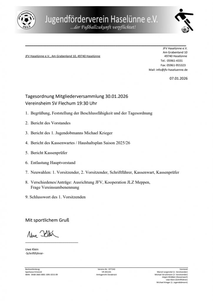 Am 30.01.2026 um 19:30 Uhr findet die jährliche Mitgliederversammlung im Vereinsheim am Sportplatz Flechum statt. Alle Mitglieder sind herzlich eingeladen.